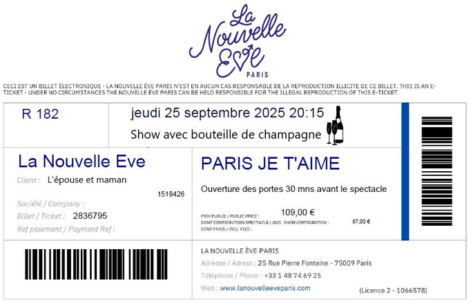 Une surprise attendait la mère et l'épouse lors de leur séjour à Paris. Une inoubliable soirée de Cabaret. Situé au pied de la butte Montmartre, le cabaret La Nouvelle Eve, est l'un des plus anciens et des plus élégants théâtres de revue de Paris. Inauguré en 1898 sous le nom de «Fantaisies Parisiennes», le théâtre accueille des pièces de maîtres tels que Desfontaines, Scribe, Labiche et Feydeau, incarnant l'élégance de la Belle Époque.