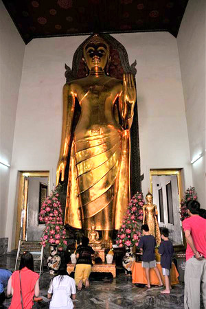 L'entrée principale est l'une des 16 portes qui entourent l'enceinte fortifiée. Ces entrées sont gardées par d'énormes géants de pierre chinois. La plupart sont des « farang », des Occidentaux coiffés de chapeaux à larges bords et armés d'une épée. Je parie que vous les trouvez plus effrayants que les démons gardiens du Wat Phra Kaew ! Lorsque les navires siamois exportaient du riz vers la Chine, ils rapportaient ces statues pour compenser leur perte de poids.